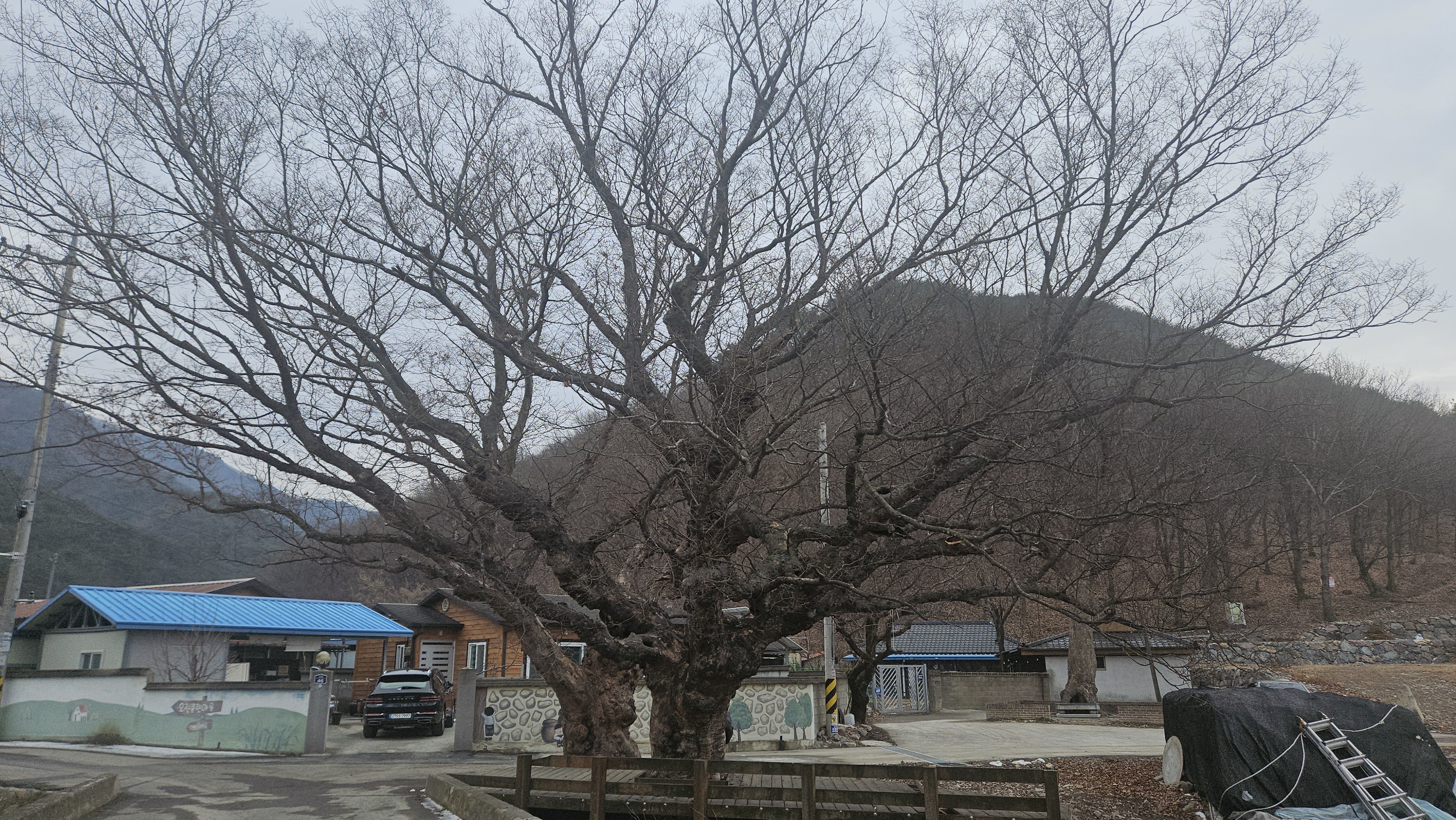 마을의 멋진 나무를 지나고